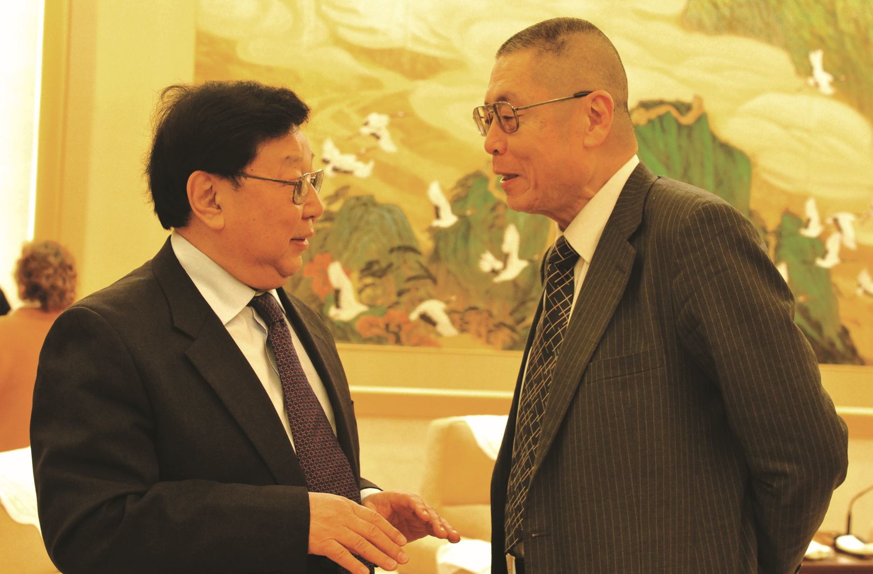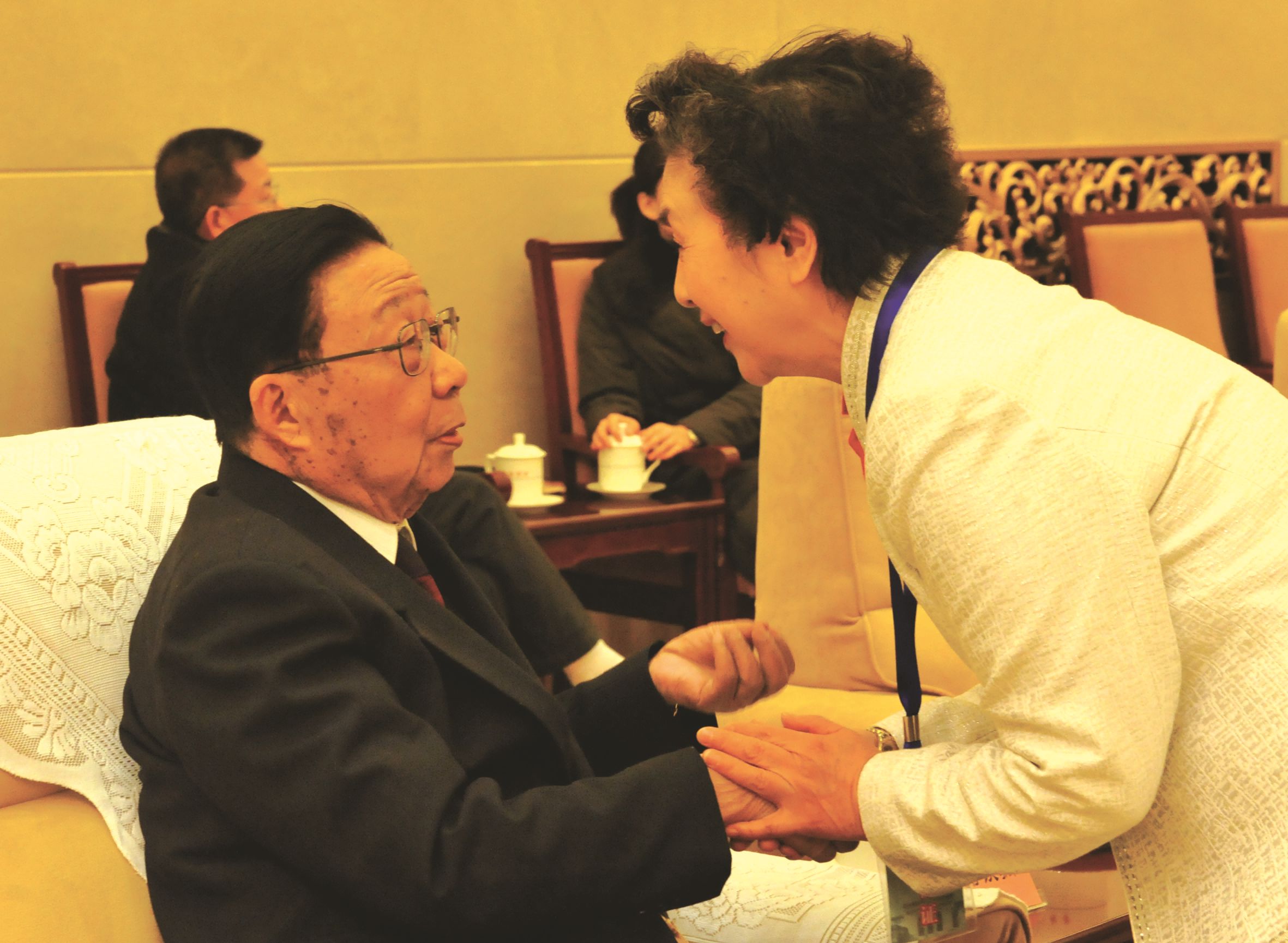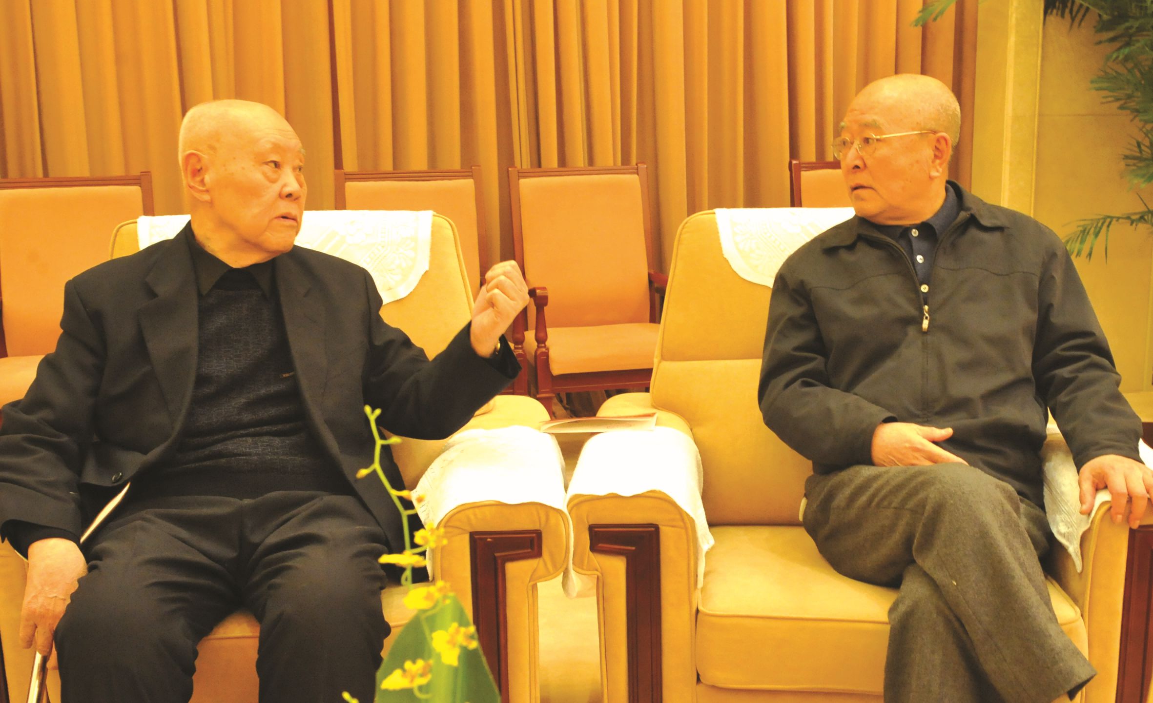 第十一届全国政协副主席郑万通(左一)与钢琴家刘诗昆(右一)亲切交谈