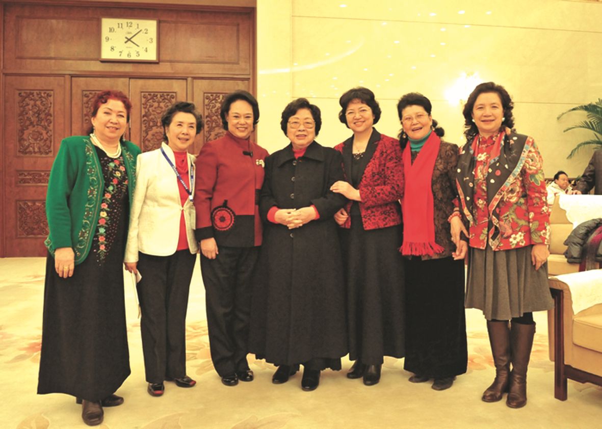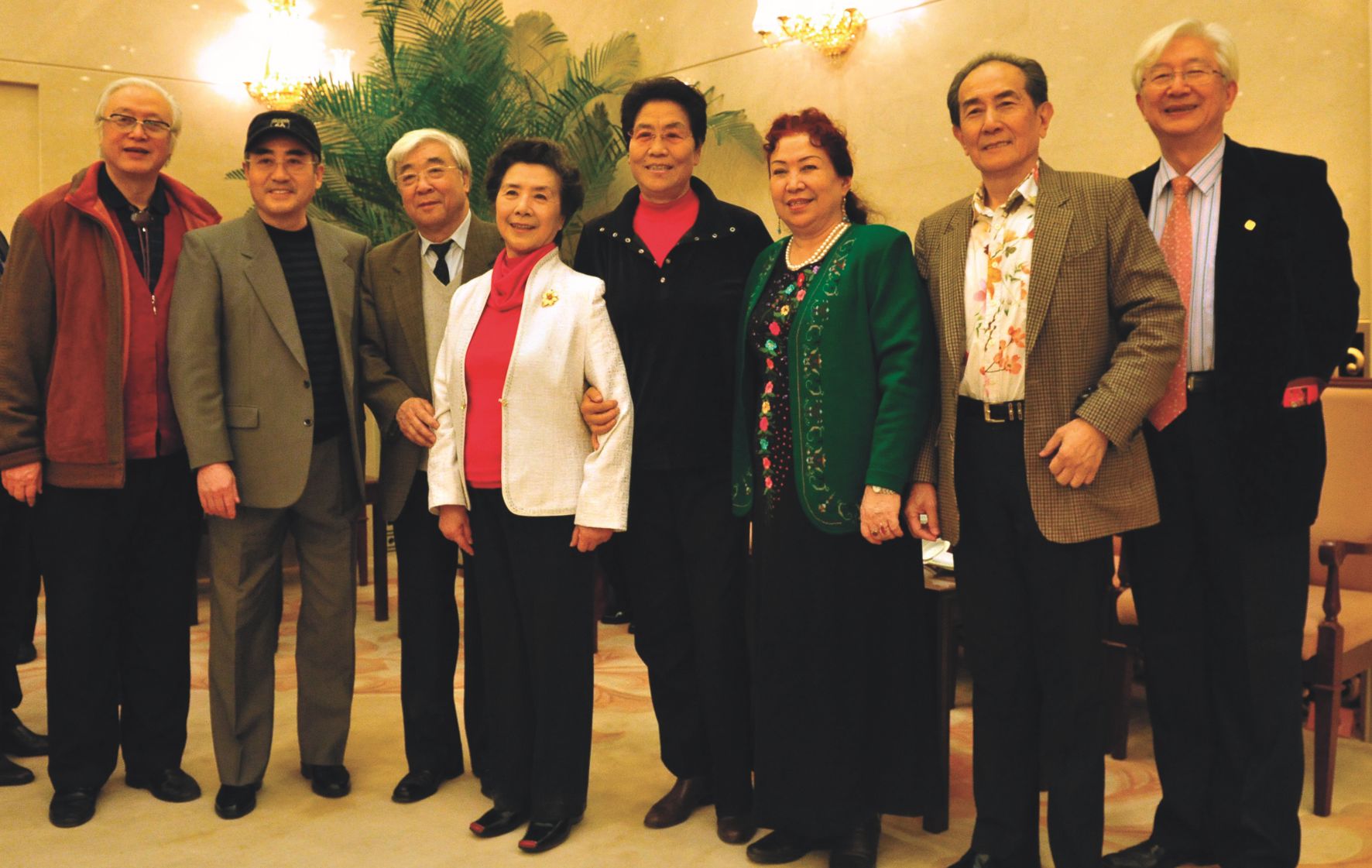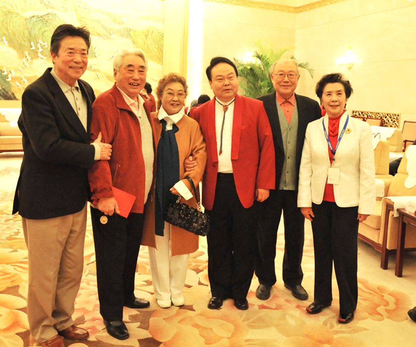 协会名誉会长赵青(左二)与王昆(左四)邓玉华(左三)耿莲凤(右三)莫德格玛(右二)姚珠珠(右一) 阿依吐拉(左一)等歌舞艺术家们合影